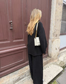 Pantalon à coupe large et jambe très évasée. Ceinture élastiquée pour un enfilage facile et un confort optimal. Tissu léger avec tombé souple. Finition sans poches pour une silhouette épurée....